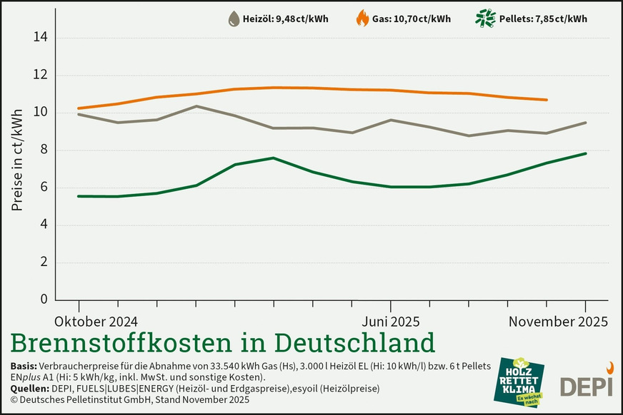 Der Preis für eine Kilowattstunde Wärme aus im November 2025 zum DEPI-Pelletpreis gekauften Pellets beträgt 7,85 Ct/kWh. Damit gibt es einen Preisvorteil zu einem aktuellen Heizöleinkauf von rund 17,2 % (Vergleichsbasis siehe Grafik mit einem auf den Heizwert bezogenen Jahresnutzungsgrad von 1,0).