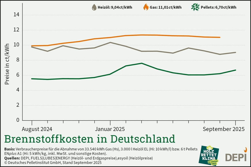 Der Preis für eine Kilowattstunde Wärme aus im September 2025 zum DEPI-Pelletpreis gekauften Pellets beträgt 6,70 Ct/kWh. Damit gibt es einen Preisvorteil zu einem aktuellen Heizöleinkauf von rund 26 % (Vergleichsbasis siehe Grafik mit einem auf den Heizwert bezogenen Jahresnutzungsgrad von 1,0).