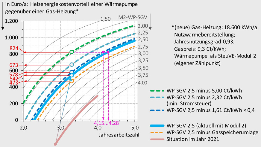 … nach rechts und dann nach unten: Um den Vorteil aus der 5-Ct/kWh-Strompreisentlastungs-Ankündigung rein technisch äquivalent zu erreichen, müsste die Jahresarbeitszahl kostenfrei von 3,3 auf 4,15…4,28 gesteigert werden.
