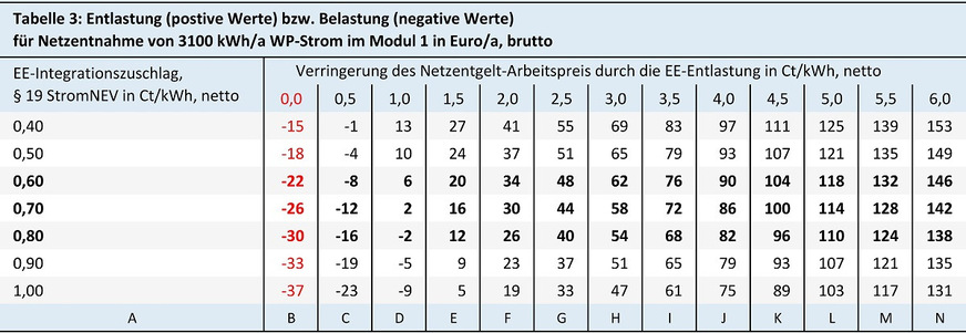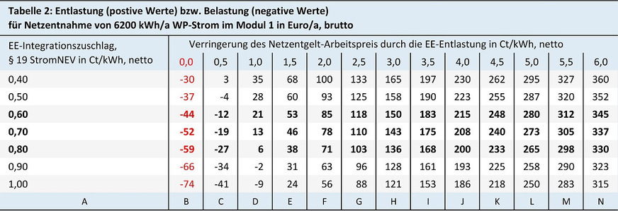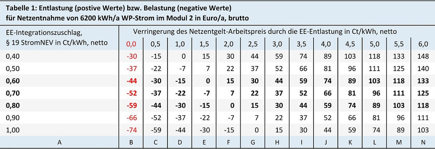 Im Modul 1 entsteht in Entlastungsgebieten aufgrund der anderen Netzentgelt-Reduzierung eine ganz andere Dynamik, die zudem von der tatsächlichen Netzentnahme für die Wärmepumpe abhängig ist: Die EE-Entlastung gilt für die gesamte Netzentnahme, jedoch sind davon die EE-Entlastung für 750 kWh abzuziehen, da sich auch die pauschale Modul-1-Netzengeltreduzierung verringert. Zudem wird die gesamte Strommenge mit dem EE-Integrationszuschlag belastet.