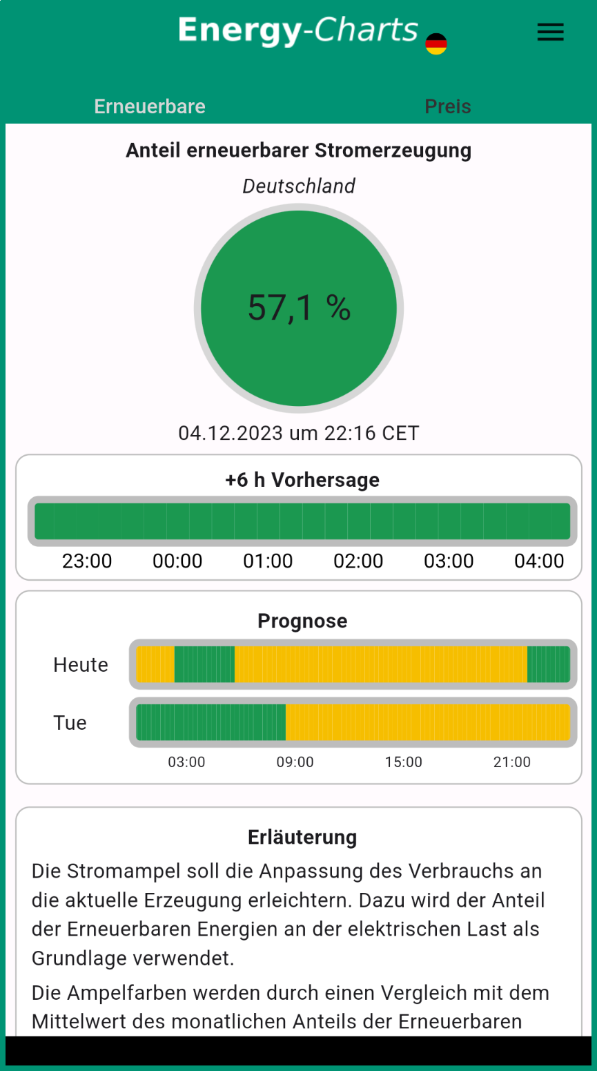 Die Stromampel-App (Android) des Fraunhofer-Instituts für Solare Energiesysteme ISE zeigt für zwölf europäische Länder den aktuellen Anteil Erneuerbarer Energien an der Stromerzeugung und für 34 Länder den Day-Ahead-Börsenstrompreis an. Steuerbare Stromverbräuche können auf dieser Basis angepasst werden.