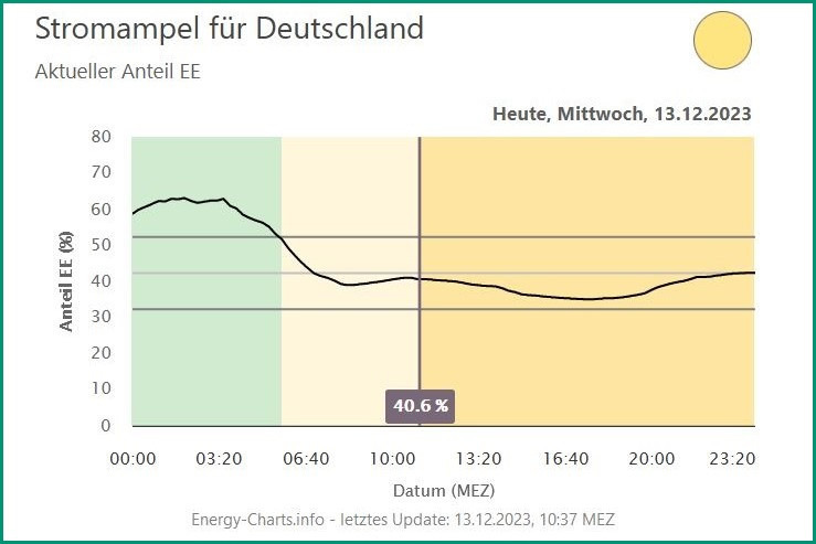 Grundlage der Ampel-Anzeige ist die Relation zwischen dem aktuellen Erneuerbaren-Energien-Anteil und dem durchschnittlichen Angebot aus den letzten fünf Jahren für den jeweiligen Monat (z. B. 48,0 % für den Monat Juni). Liegt der aktuelle Anteil 10 % unter diesem Durchschnitt, ist die Ampel rot, liegt er 10 % darüber, wird grün angezeigt. Die Werte dazwischen sind gelb. Die Stromdaten liegen dabei im Viertelstunden-Takt vor. Die Daten werden in der Regel jede Stunde neu geladen, um immer die aktuelle Prognose zu zeigen. Als Vorhersage stehen die Daten in aller Regel ab 19:00 Uhr für den nächsten Tag zur Verfügung.