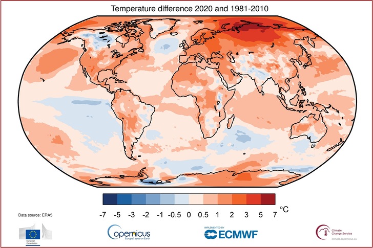In Europa lagen die Temperaturen durchschnittlich 1,6 K über dem Referenzzeitraum 1981-2010 und 0,4 K über 2019, dem bisher wärmsten Jahr in Europa. Weltweit betrachtet war das Jahr 2020 ebenso warm wie das bisherige Rekordjahr 2016.