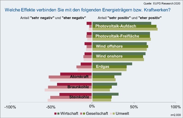 Negative Effekte werden insbesondere den Energieträgern Braunkohle, Steinkohle und Kernenergie zugeschrieben. Die Auswirkungen auf Umwelt und Gesellschaft werden hierbei von den deutschen Bürgern deutlich negativer wahrgenommen als auf die Wirtschaft. Insgesamt sieht jede zweite befragte Person negative Folgen für Umwelt und Gesellschaft durch den Betrieb von Kernenergie- und Kohlekraftwerken. Ein engagierterer und schnellerer Ausstiegspfad aus der Kohle wäre demnach im Sinne der Bürger.