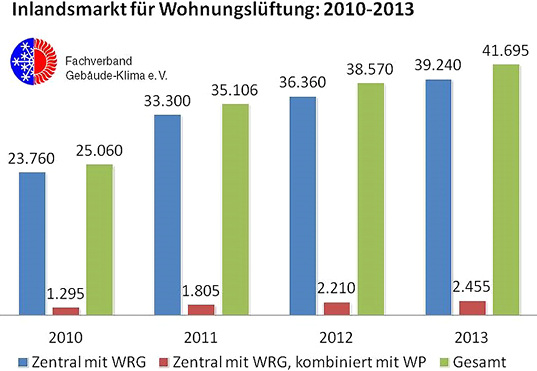 Der Markt für die kontrollierte Wohnungslüftung in Deutschland ist im Jahr 2013 erneut deutlich gewachsen. Dies zeigt die gemeinsame Statistik des Fachverbands Gebäude-Klima (FGK) und des Bundesindustrieverbands Deutschland Haus-, Energie- und Umwelttechnik (BDH). Insgesamt sind 41 695 Zentralgeräte mit Wärmerückgewinnung neu installiert worden, 8,1 % mehr als im Jahr 2012. Mit rund 94 % sind die vom Heizsystem unabhängigen Geräte mit Wärmerückgewinnung weiterhin das größte Segment im Zentralgeräte-Markt. 39 240 dieser Geräte wurden 2013 verkauft – ein Wachstum von rund 8,1 %. Die mit einer Wärmepumpe kombinierten Kompaktgeräte hatten 2013 einen Anteil von 5,9 %, insgesamt wurden 2455 entsprechende Geräte installiert, 11,1 % mehr als im Vorjahr. FGK-Geschäftsführer Günther Mertz rechnet langfristig mit weiterhin stabilen Wachstumsraten in dieser Größenordnung. „Gerade im Neubau hat sich bei Architekten und Bauherren die Erkenntnis durchgesetzt, dass sich Niedrigenergiehäuser ohne kontrollierte Wohnungslüftung nicht betreiben lassen.“ https://www.fgk.de/