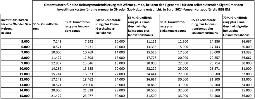 Bei Investitionskosten von 30 000 Euro und Heizungs-Tausch-Bonus gib es aktuell einen Zuschuss von 6000 Euro. Mit dem 2024-Ampel-Konzept steigt der Zuschuss auf 15 000 Euro und mit dem Einkommensbonus sogar auf 21 000 Euro. Der Förderzuschuss erhöht sich somit um 9000 bzw. 15 000 Euro.