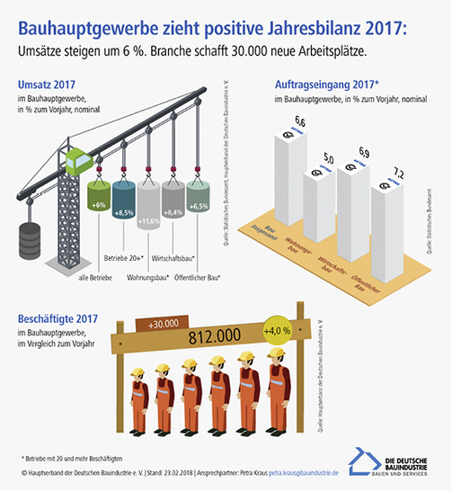 Das deutsche Bauhauptgewerbe hat das Baujahr 2017 mit einem Umsatzplus von nominal 6,0 % abgeschlossen (real: + 2,7 %). Damit übertrifft das Jahresergebnis sogar noch die Verbandsprognose zur Jahresauftaktpressekonferenz von plus 5 %. Die Branche erwirtschaftete 2017 nach Angaben des Hauptverbands der Deutschen Bauindustrie (HDB) einen baugewerblichen Umsatz von 114 Mrd. Euro. Die größeren Baubetriebe mit 20 und mehr Beschäftigten meldeten sogar ein Umsatzplus von 8,5 % (real: + 5,1 %). Von der guten Baukonjunktur haben 2017 somit die größeren Betriebe überdurchschnittlich profitiert. Der Hauptverband führt dies darauf zurück, dass der aktuelle Konjunkturaufschwung vor allem vom Neubau getragen wird, kleinere Unternehmen aber eher bei Baumaßnahmen im Bestand gefragt sind. Hinzu kommt, dass die Kleinbetriebe mit 1 bis 19 Beschäftigten stärker von personellen Kapazitätsengpässen betroffen sind. Größere Betriebe haben hingegen eher die Möglichkeit, ihren zusätzlichen Personalbedarf durch die Anwerbung ausländischer Fachkräfte zu decken: Während die Zahl der deutschen Beschäftigten im Bauhauptgewerbe 2017 lediglich um 1 % zunahm, lag die der ausländischen um 16 % über dem Vorjahresniveau. Insgesamt stockten die Betriebe ihren Personalbestand um 30 000 bzw. 4 % auf 812 000 Beschäftigte im Jahresdurchschnitt auf. Damit hat die Branche erstmals seit 2003 wieder mehr als 800 000 Beschäftigte und schuf seit dem Tiefpunkt im Jahr 2009 mehr als 100 000 neue Stellen. Die Aussichten für das laufende Jahr sind vielversprechend: Die Baubetriebe mit 20 und mehr Beschäftigten meldeten für 2017 einen Zuwachs ihres Auftragseingangs von nominal 6,6 %. Im Dezember legte der Auftragseingang im Vergleich zum Vorjahresmonat sogar noch um 24,3 % zu. Auch im Vergleich zum Vormonat sind die Aufträge nach Berechnungen des Statistischen Bundesamtes (arbeitstäglich-, saison- und preisbereinigt) gestiegen (+ 16,8 %). Insgesamt spricht alles dafür, dass die Umsatzprognose aus der Jahresauftaktpressekonferenz für 2018 von plus 4 % übertroffen wird. Der Wohnungsbau war 2017 abermals die stärkste Stütze der Baukonjunktur: Der Umsatz der Betriebe mit 20 und mehr Beschäftigten legte um 11,6 % zu. Aufgrund der nach wie vor steigenden Auftragseingänge (Baubetriebe mit 20 und mehr Beschäftigten) – im Gesamtjahr 2017 um 5,0 %, im Dezember sogar um 39,8 % – erwartet der HDB für 2018 eine Fortsetzung der guten Entwicklung. Der Genehmigungsüberhang von etwa 400 000 Wohnungen werde die Produktion trotz zuletzt gesunkener Genehmigungszahlen noch einige Zeit tragen. Auch der Wirtschaftsbau hat das Baujahr 2017 positiv abgeschlossen: Der Umsatz lag um 8,4 % über dem Niveau von 2016, der Auftragseingang um 6,9 %. Dass auch 2018 gut laufen wird, dafür spricht die Entwicklung des Auftragseingangs, welcher um 7,2 % gestiegen ist (Angaben zu Umsatz und Auftragseingang jeweils für Baubetriebe mit 20 und mehr Beschäftigten). www.bauindustrie.de
