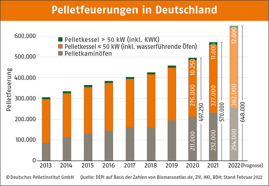 Mit 86.500 neuen Anlagen wurden knapp 40 % mehr als im Vorjahr installiert. Damit waren in Deutschland Ende 2021 570.000 Pelletfeuerungen in Betrieb. Ihren Beitrag zum Klimaschutz verdeutlicht die eingesparte CO2-Menge von erstmals über 4 Mio. Tonnen. Auf-grund attraktiver Förderbedingungen und ambitionierter Klimaziele rechnet der DEPV für 2022 mit einem steigenden Zubau von insgesamt 91.000 Pelletfeuerungen.