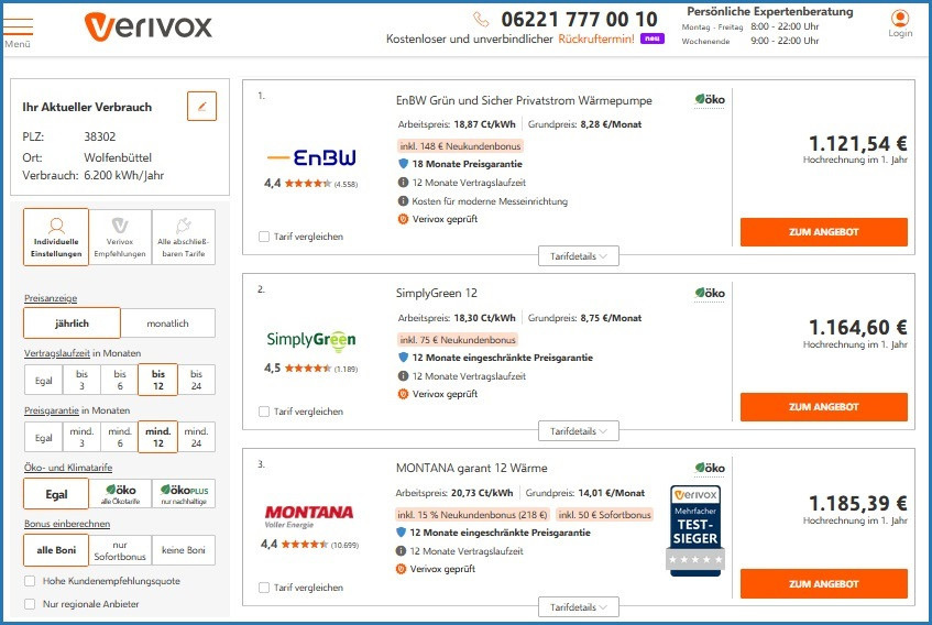 Für den Standort der Heizungsanlage an der TGA+E-Redaktionsadresse in 38302 Wolfenbüttel variieren bei Verivox die reinen Arbeitspreise mit den Einstellungen „Wärmepumpenstrom, separater Stromzähler, Eintarifzähler, 12 Monate Vertragslaufzeit, 12 Monate Preisgarantie, alle Tarife“ auf den fünf ersten Plätzen (niedrigster Preis-Sortierung) für die Auswahl „alle Boni“ zwischen 18,30 und 20,73 Ct/kWhel und bei „keine Boni“ zwischen 18,30 und 19,50 Ct/kWhel.