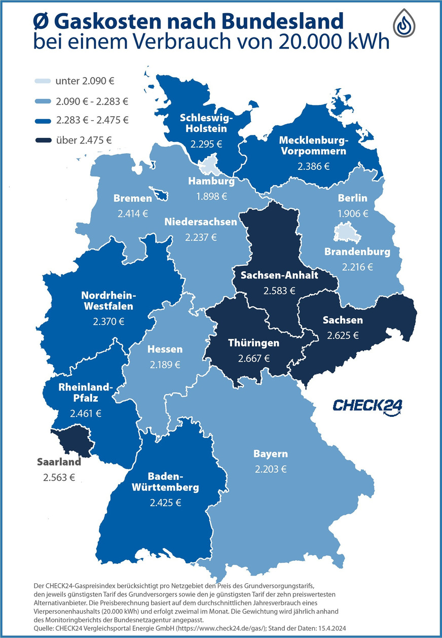 Im Bild: Mittlere Kosten für das Heizen mit Erdgas bei einer Netzentnahme von 20 000 kWh/a (Preisfindung siehe Text unter der Karte). Zieht man von den Bundesland-Gaskosten einen Grundpreis von 120 Euro/a ab, ergibt sich ein Erdgas-Arbeitspreis zwischen 8,89 Ct/kWh in Hamburg, 10,35 Ct/kWh im günstigsten Flächenland Hessen und 12,74 Ct/kWh in Thüringen. Für ein Strom-/Gaspreisverhältnis von 2,5 dürfte der Arbeitspreis für Wärmepumpenstrom zwischen 22,23 kWh (Hamburg), 25,87 Ct/kWh in Hessen und 31,85 Ct/kWh (Thüringen) liegen.