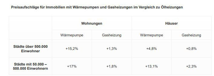 In den 14 größten Städten (mehr als 500 000 Einwohner) ist der Angebotspreis einer Eigentumswohnung mit Wärmepumpe im Mittel um 15,2 % höher als für eine vergleichbare Immobilie mit Öl-Heizung. Geräte mit Erdgas, die gemeinhin als etwas moderner gelten als Heizöl, haben hingegen kaum einen preissteigernden Effekt auf den Immobilienpreis: Der Preis ist bei Gas-Heizungen nur im niedrigen einstelligen Prozentbereich höher als bei Öl-Anlagen.