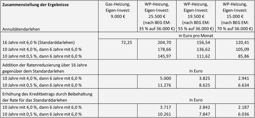 Als Vergleichsfall wird der Umstieg auf eine Wärmepumpen-Heizung mit zwei unterschiedlichen Einbaukosten (30.000 und 36.000 Euro), drei Fördersätzen (35, 55 und 70 %) sowie Annuitätendarlehen mit drei unterschiedlichen Sollzinsen betrachtet.