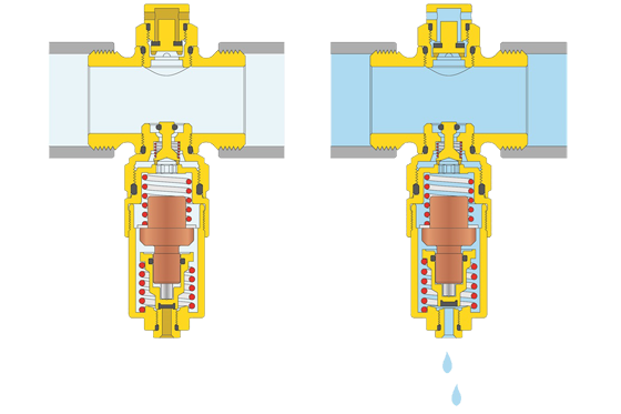 Das Frostschutzventil der Serie 108 von Caleffi entleert bei einer Monoblock-Wärmepumpe oder Hydrosplit-Wärmepumpenanlage den Heizkreis, wenn für diesen Frostfreiheit nicht gewährleistet werden kann. Es arbeitet rein mechanisch und öffnet zum Entleeren des Systems, sobald die Temperatur des Mediums eine Temperatur von 3 °C erreicht. Es schließt, sobald die Mediumtemperatur wieder 4 °C erreicht hat.