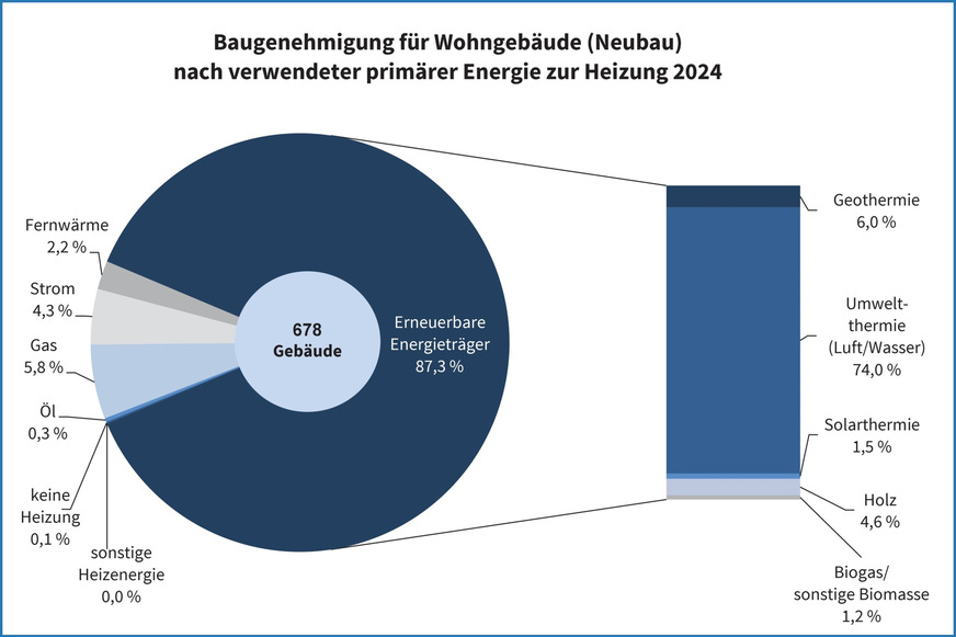 Laut den Jahresergebnissen der Baugenehmigungsstatistik 2024 für Thüringen werden zur primären Beheizung der 678 neu geplanten Wohngebäude nach der Fertigstellung zu 87,3 % regenerative Energien genutzt. Gegenüber dem Vorjahr ist dies nach Mitteilung des Thüringer Landesamtes für Statistik eine Zunahme um 2,1 Prozentpunkte.
