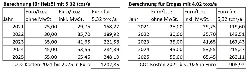 ● Heizöl (5,32 tCO2/a): 158 Euro (2021) und 1203 Euro (2021 bis 2025)
