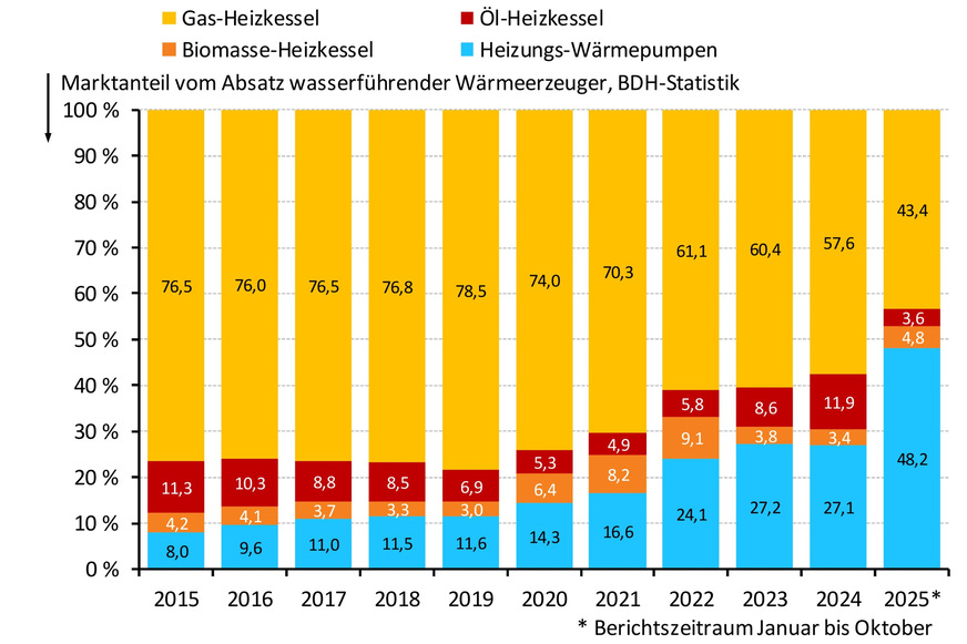 Von Januar bis Oktober 2025 liegt der Wärmeerzeugerabsatz 14 % unter dem Vorjahreszeitraum. Wärmepumpen legten um 57 % zu und hatten einen Marktanteil von 48 %.