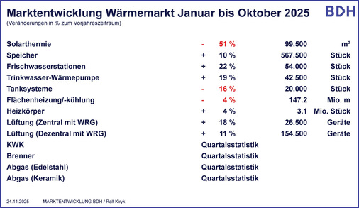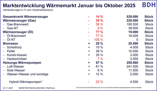 Einen positiven Trend zeige sich beim Absatz von Wärmepumpen. Bis einschließlich Oktober 2025 wurden über alle Wärmepumpen-Technologien hinweg rund 255.000 Geräte verkauft – ein Plus von 57 % im Vergleich zum Vorjahreszeitraum. Für das Gesamtjahr prognostiziert der BDH rund 284.000 abgesetzte Wärmepumpen und damit ein Wachstum von 47 % gegenüber dem Vorjahr. Das liegt unter der Prognose von ca. 300.000, die der Bundesverband Wärmepumpe (BWP) nach starken Absatzzahlen im September und Oktober von jeweils über 30.000 Heizungs-Wärmepumpen im Jahr 2025 wenige Tage zuvor abgegeben hat.