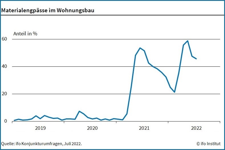 Die Materialengpässe – die sich mit dem russischen Einmarsch in die Ukraine drastisch verschärft hatten – entspannen sich nur langsam. Im Juli 2022 meldeten noch 45,6 % der Betriebe im Wohnungsbau Lieferengpässe. Im Vormonat hatte der Anteil bei 47,6 % gelegen.