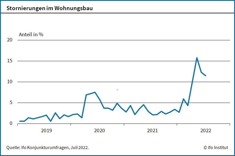 Im Wohnungsbau werden immer noch viele Projekte gestrichen. Der Anteil der betroffenen Unternehmen lag im Juli 2022 bei 11,5 %, nach 12,3 % im Vormonat. Im Mai hatte der Anteil sogar 15,8 % betragen. Das geht aus den Umfragen des hervor.