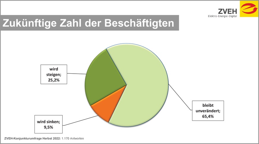 Dass bei den Betrieben aller Bedenken zum Trotz die Weichen auf Wachstum gestellt sind, zeigt auch ein Blick auf die Beschäftigtenzahlen der vergangenen Monate, in denen die Folgen des Ukraine-Kriegs ja durchaus bereits spürbar waren. So konnte jedes fünfte E-Unternehmen zwischen Frühjahr und Herbst 2022 die Zahl seiner Mitarbeiter erhöhen (21,4 %). Damit spiegelt die Umfrage den seit Jahren anhaltenden Branchentrend, dass größere Betriebe bei den Beschäftigtenzahlen kontinuierlich zulegen, während die Zahl der kleinen und Kleinstunternehmen abnimmt.