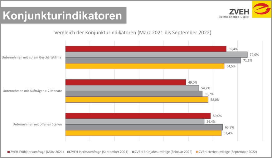 Mit dem Kriegsausbruch in der Ukraine erlebt die Welt eine Zeitenwende, die daraus resultierende Energiekrise und die zunehmende Inflation sorgen derzeit für eher pessimistische Konjunkturerwartungen. Umso erstaunlicher sind die Ergebnisse der Herbst-Konjunkturumfrage, die der Zentralverband der Deutschen Elektro- und Informationshandwerke (ZVEH) vom 12. bis 16. September 2022 durchführen ließ und an der rund 1200 elektrohandwerkliche Betriebe teilgenommen haben.