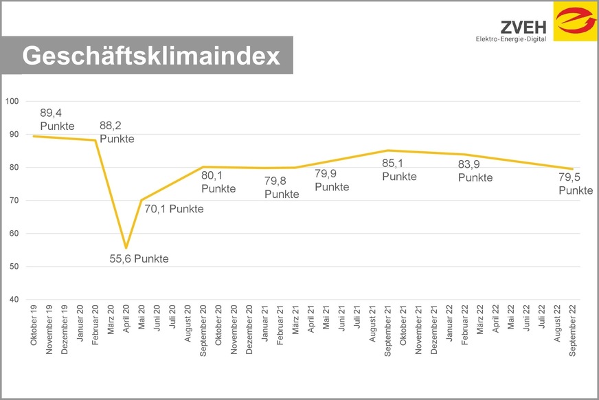 Mit rund 80 Punkten ist der Geschäftsklimaindex in den Elektro-Handwerken weiterhin hoch. Das ergab die Herbst-Konjunkturumfrage 2022 des ZVEH. Auch die Auftragsbücher sind voll – u. a. weil die Nachfrage nach Photovoltaik-Anlagen, Ladeinfrastruktur und Wärmepumpen gestiegen ist. Allerdings macht sich auch der Fachkräftemangel bemerkbar.