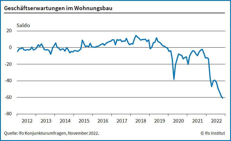 Und die Geschäftserwartungen für das kommende halbe Jahr trübten sich nochmals ein. Mit minus 60,9 Punkten markierten sie einen neuen Negativrekord seit Beginn der Erhebung 1991. Leiss: „Die Geschäftsperspektiven im Wohnungsbau erscheinen finster, eine Mehrheit der Unternehmen befürchtet Rückgänge im kommenden halben Jahr.“