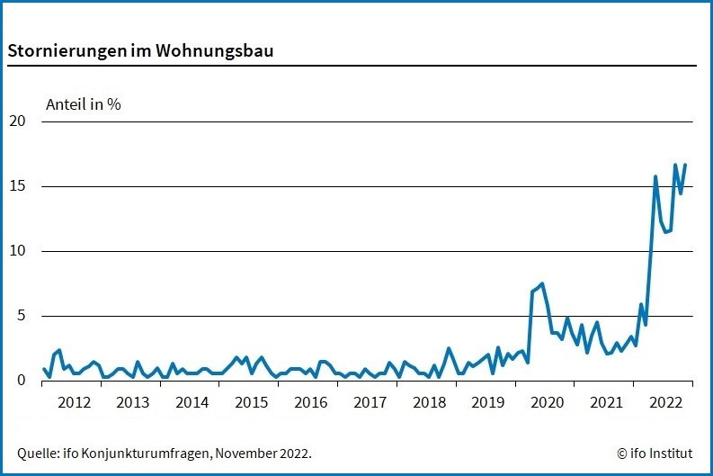 Laut einer Umfrage des ifo Instituts waren im November 2022 von den befragten Bauunternehmen 16,7 % von Stornierungen aus dem Bereich Wohnungsbau betroffen. Im Vormonat hatten dies 14,5 % angegeben.
