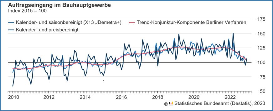 Im Dezember 2022 lag der reale Auftragseingang im Bauhauptgewerbe saison- und kalenderbereinigt 1,8 % höher als im Vormonat. Im Vorjahresvergleich sank der reale Auftragseingang im Dezember 2022 kalenderbereinigt um 23,4 %.