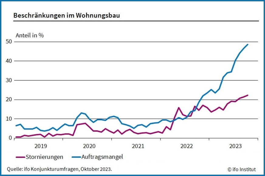 Das ifo Institut vermeldet auf Basis seiner regelmäßigen Umfragen für Oktober 2023 erneut einen Rekord bei den Stornierungen im Wohnungsbau.