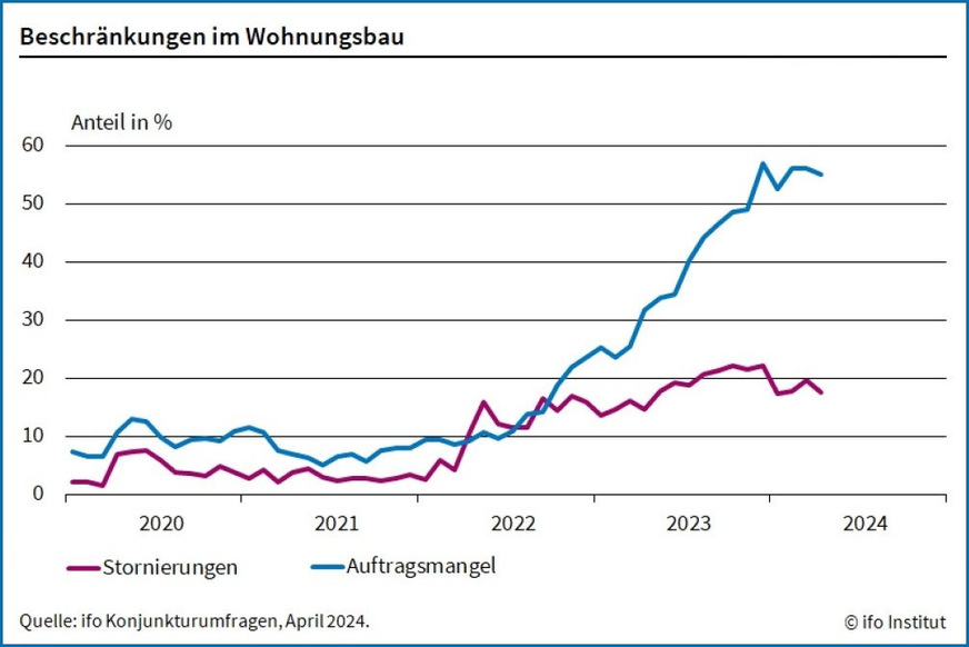 Dem Wohnungsbau in Deutschland fehlen Aufträge. Mehr als jede zweite Firma (55,2 %) berichtete im April 2024 von Auftragsmangel. Im März 2024 waren es 56,2 %.