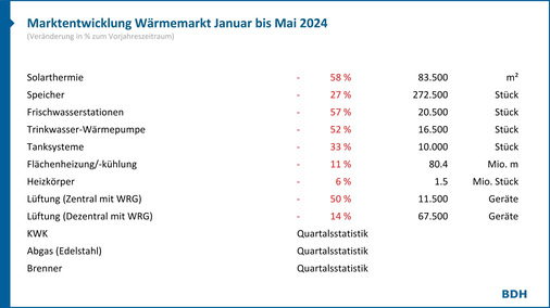 Eine negative Absatzentwicklung gibt es in den ersten 5 Monaten 2024 auch bei praktisch allen heiztechnischen Systemkomponenten. So setzten die Hersteller 58 % weniger solarthermische Kollektorfläche und 50 % weniger Wohnungslüftungsanlagen mit Wärmerückgewinnung ab. Auch Heizkörper und Fußbodenheizungen verzeichnen Rückgänge von 6 % und 11 %.