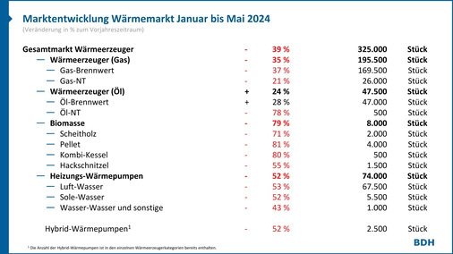 Der Bundesverband der Deutschen Heizungsindustrie (BDH) hat am 9. Juli 2024 Absatzzahlen der Hersteller von Wärmeerzeugern bis Ende Mai 2024 veröffentlicht. Sie zeigen, dass bis zu diesem Zeitpunkt die nach dem Inkrafttreten des Gebäudeenergiegesetzes erwartete Nachfragedelle noch anhält: Der Absatz für neue Heizungen ist in den ersten 5 Monaten 2024 gegenüber dem Vorjahreszeitrum um 39 % gesunken.