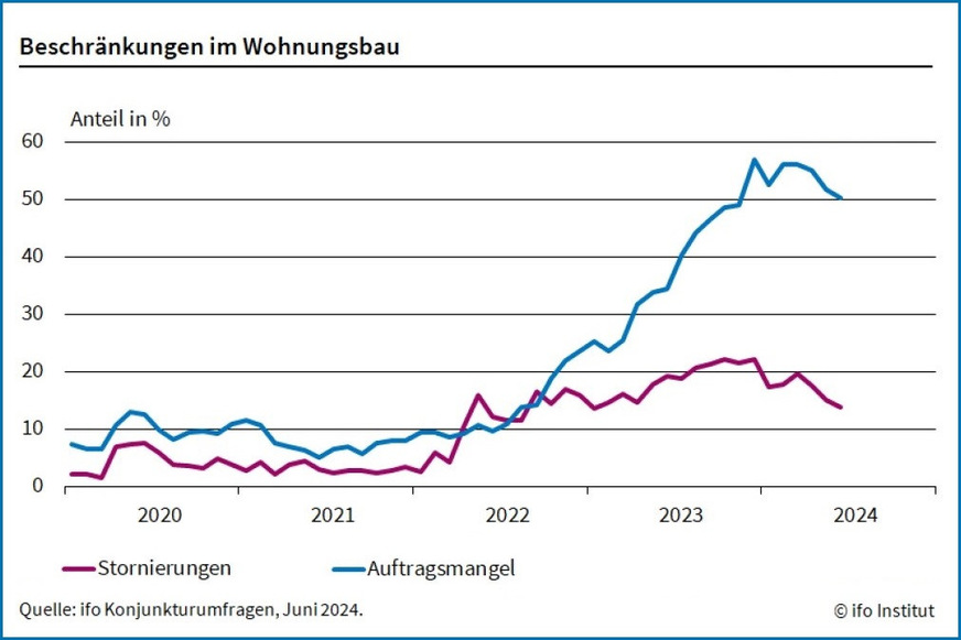 Im Juni 2024 haben 50,2 % der im Rahmen der ifo Konjunkturumfrage befragten Bauunternehmen von einem Auftragsmangel im Wohnungsbau berichtet, nach 51,7 % im Mai 2024. Klaus Wohlrabe, Leiter der ifo Umfragen: „Der Mangel an neuen Aufträgen ist weiterhin ein großes Problem. Häuslebauer sind zurückhaltend, auch weil die Leitzinssenkung der Europäischen Zentralbank vorerst nur ein erster Schritt ist. Bei den Finanzierungskosten hat sich noch nicht viel getan.