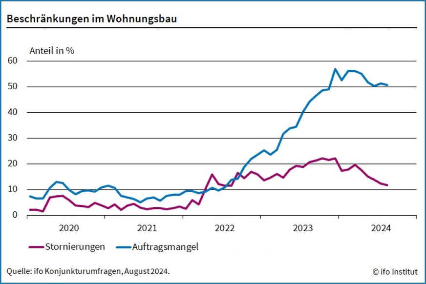 Im August 2024 haben 50,6 % der im Rahmen der ifo Konjunkturumfrage befragten Bauunternehmen von einem Auftragsmangel im Wohnungsbau berichtet, nach 51,3 % im Juli 2024 (Juni: 50,2 %). Der Anteil liegt nun seit neun Monaten über der 50-Prozent-Marke. „Die Krise im Wohnungsbau wird sich noch lange hinziehen“, sagt Klaus Wohlrabe, Leiter der ifo Umfragen. „Die Unternehmen suchen weiterhin nach Hoffnungssignalen.“