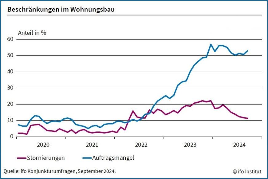 Im September 2024 haben 52,9 % der im Rahmen der ifo Konjunkturumfrage befragten Bauunternehmen von einem Auftragsmangel im Wohnungsbau berichtet, nach 50,6 % im August 2024 (Juli: 51,3 %). „Die Zinssenkungen der Zentralbank konnten noch keinen Effekt entfalten“, sagt Klaus Wohlrabe, Leiter der ifo Umfragen. „Die Kreditzinsen für Haushalte für den Wohnungsbau sind weiterhin hoch.“