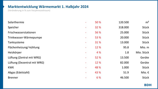 Von Januar bis Mai 2024 lag der Gesamtabsatz bei einem Minus von 35 %. Ein weiterer Absturz war jedoch abzusehen, weil die Rekordwerte 2023 insbesondere mit einem steilen Absatzhochlauf in der Jahresmitte mit einem Hochpunkt bei Gas- und Öl-Heizungen im 3. Quartal einherging. Beispielsweise wurden im Juni 2023 rund 84 000 Gas-Heizungen (Juni 2024: 27 500), etwa 10 000 Öl-Heizungen (Juni 2024: 7000) und ca. 42 500 Wärmepumpen (Juni 2024: 16 000) ausgeliefert.