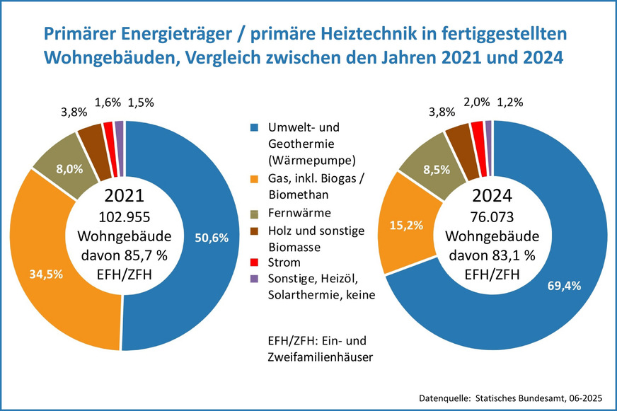 Bei den 2024 fertiggestellten Wohngebäuden dominieren Wärmepumpen als primäres Heizsystem mit einem Anteil von 69,4 % – ein Zuwachs um 4,9 Prozentpunkte gegenüber dem Vorjahr.