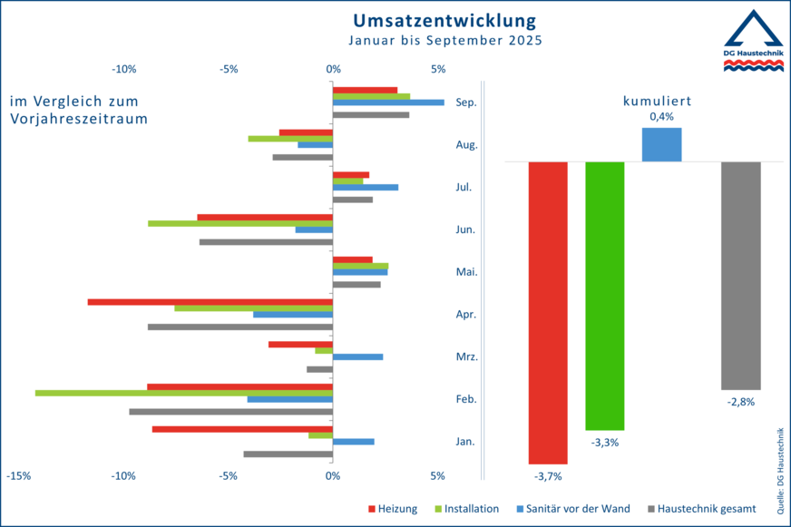 Die Mitglieder des DG Haustechnik melden in der aktuellen anonymen Umsatzstatistik-Abfrage erstmals seit Monaten für den September – im Vergleich zum Vorjahresmonat – in allen Warensegmenten ein deutlicheres Plus. Insbesondere ist hier Sanitär mit +5,3 % zu nennen. Diese Werte verbessern das Ergebnis für den Zeitraum Januar bis September im Vergleich zu den Vorjahreswerten etwas. Kumuliert bleibt nach drei Quartalen derzeit jedoch noch ein Minus von 2,8 % gegenüber dem Vergleichszeitraum 2024.