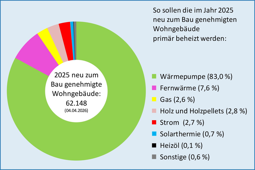 Für 83 % der im Kalenderjahr 2025 neu zum Bau genehmigten 62.148 Wohngebäude wurde beim Bauantrag eine Wärmepumpe als primäres Heizsystem angegeben.