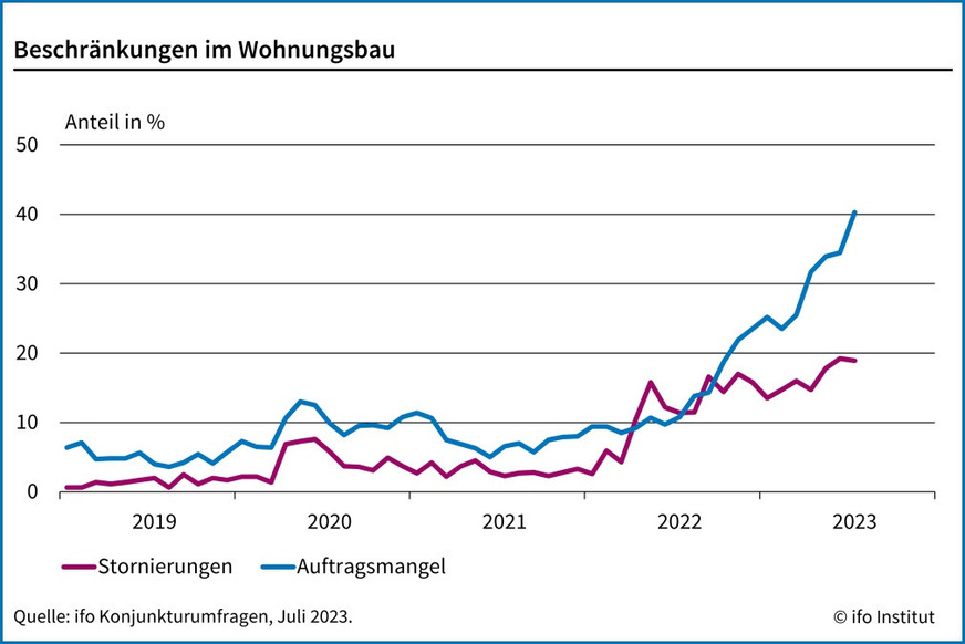 Das ifo Institut vermeldet auf Basis seiner regelmäßigen Umfragen für Juli 2023 einen neuen Rekord beim Auftragsmangel im Wohnungsbau.