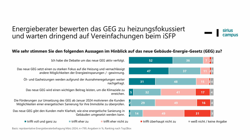 Dies sind die Ergebnisse der Sirius Campus Marktuntersuchung „Monitor zur Energiewende – Perspektive der Energieberater“, einer repräsentativen Befragung unter den Verbandsmitgliedern des Gebäudeenergieberater Ingenieure Handwerker Bundesverbands (GIH), des Deutschen Energieberater-Netzwerks (DEN) und des Zentralverbands Deutscher Schornsteinfeger (ZDS). Die Stichprobe mit 799 Online-Interviews wurde mit Unterstützung der drei Verbände im März 2024 erhoben.
