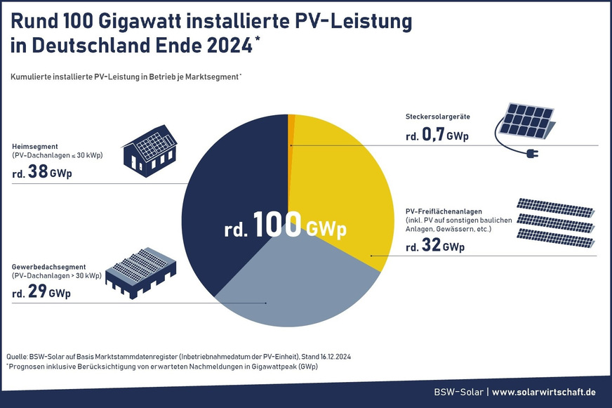 Allein im Jahr 2024 sind in Deutschland mehr als 1 Mio. neue Photovoltaik-Anlagen mit einer Spitzenleistung von rund 17 GWp neu installiert worden. Rund 104 GWp installierte Solarstromleistung waren Ende März 2025 in Betrieb. Rund 38 % der installierten Leistung befindet sich auf Dächern von Eigenheimen, rund 29 % auf Firmendächern, 32 % auf Freiflächen und knapp 1 % an Balkonen.