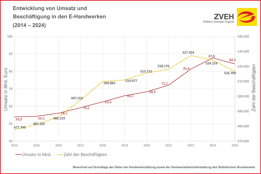 Wie erwartet, zeigt die Auswertung einen deutlichen Rückgang des Jahresumsatzes um 4,0 % auf 84,3 Mrd. (2023: 87,8 Mrd. Euro). In den Jahren zuvor war der Umsatz kontinuierlich gestiegen. Das entspricht dem Bild aus den Betrieben, die zuletzt, etwa bei der ZVEH-Frühjahrskonjunkturumfrage 2025, vermehrt Umsatzrückgänge und sinkende Auftragsvolumina gemeldet hatten.