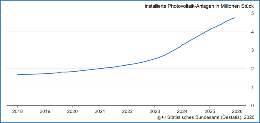 Im Jahr 2025 ist die Zahl der installierten Photovoltaik-Anlagen um 17,6 % auf 4,8 Mio. Anlagen gestiegen. Bei der Nenn-Leistung fiel der Zubau geringer aus.