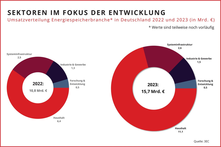 Der Bereich Haushalte verzeichnete erneut das stärkste Wachstum mit einer Zuwachsrate von über 40 %. Der Trend zur Eigenversorgung und Absicherung dieser Versorgung treibt die Installation von Energiespeichersystemen in Gebäuden und privaten Haushalten voran, trotz fallender Energiepreise.