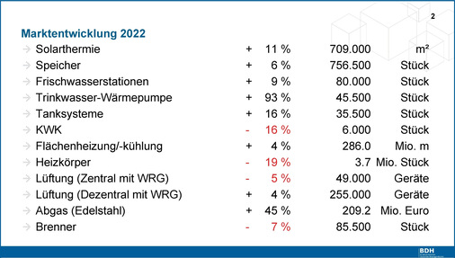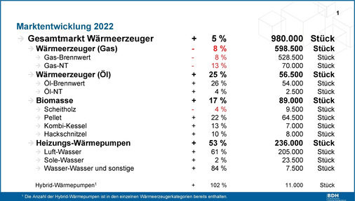 Der Bundesverband der Deutschen Heizungsindustrie (BDH) hat seine Jahresbilanz für 2022 vorgelegt. Mit einem Plus von 5 % im Gesamtmarkt gegenüber dem Vorjahr und 980 000 in Verkehr gebrachten Wärmeerzeugern blickt die Heizungsindustrie auf eine positive Entwicklung im deutschen Markt zurück.