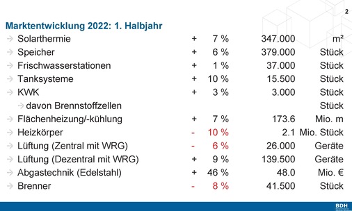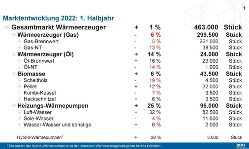 Trotz teilweise noch immer gestörter globaler Lieferketten blickt die deutsche Heizungsindustrie auf ein solides erstes Halbjahr im deutschen Markt zurück. Der Bundesverband der Deutschen Heizungsindustrie (BDH) weist in seiner Bilanz für das erste Halbjahr 2022 ein Plus von 1 % im deutschen Markt gegenüber dem Vorjahr aus. Dies entspricht insgesamt rund 463 000 in Verkehr gebrachten Wärmeerzeugern.