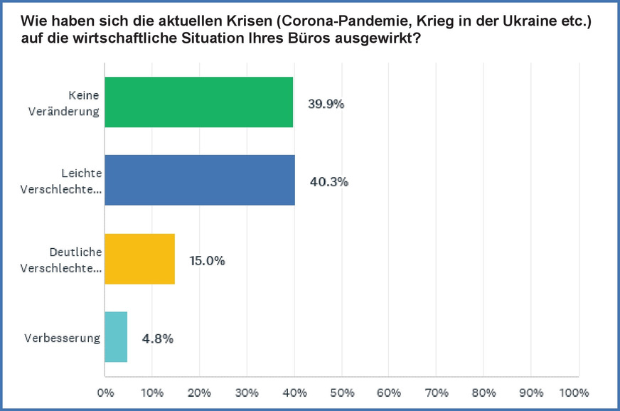 Mit 55,3 % geben mehr als die Hälfte der bayerischen Ingenieurbüros an, dass sich die aktuellen Krisen wie der Krieg in der Ukraine oder die Coronavirus-Pandemie negativ auf die wirtschaftliche Situation ihres Büros ausgewirkt haben. Die Konjunkturumfrage wurde im Zeitraum 3. März bis 10. April 2023 unter den über 7500 Mitgliedern der Bayerischen Ingenieurekammer-Bau durchgeführt. Darunter sind 4316 Inhaber von Ingenieurbüros und freiberuflich sowie gewerblich tätige Ingenieure. An der Konjunkturumfrage haben insgesamt 669 Inhaber von Ingenieurbüros und Ingenieure teilgenommen (Rücklaufquote 15,5 %).