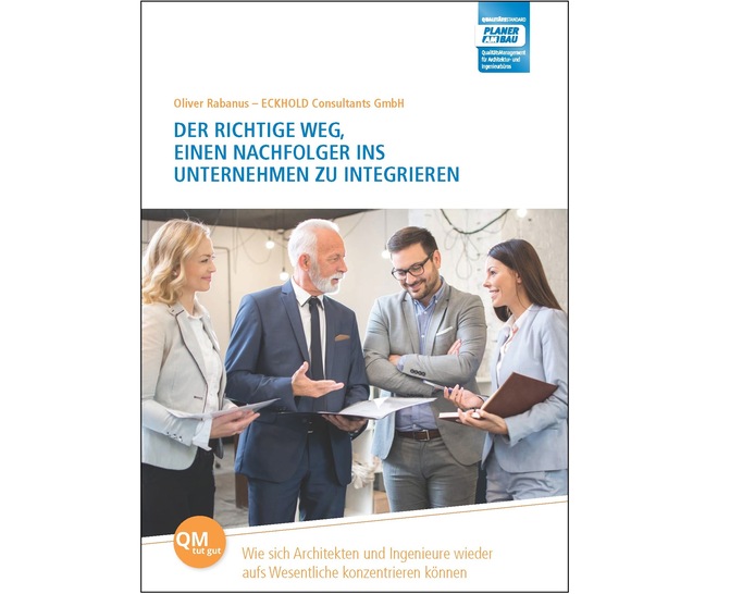 Zum Thema hat der QualitätsVerbund Planer am Bau gemeinsam mit der auf Unternehmensnachfolge in Bauplanungsbüros spezialisierten Eckhold Consultants GmbH ein eBook (6 Seiten) herausgegeben. „Oliver Rabanus: Der richtige Weg, einen Nachfolger ins Unternehmen zu integrieren“ ist bis auf weiteres auch für Nicht-Mitglieder im QualitätsVerbund Planer am Bau kostenlos und ohne Verpflichtungen im Online-Shop des QualitätsVerbunds unter www.planer-am-bau.de/infos-anfordern erhältlich. ■